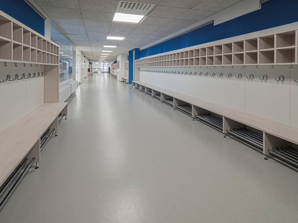 Meritori Primary School has a mathematics and science focus, which needed to be reflected in the interior design. “With the rubber floors, we had the opportunity to create geometric inlays that precisely matched the interior design plans and reflected the spirit of the school,” Uitto explained. Whether complex logos, fonts or characters, the intricate rubber inlays are produced in the factory’s own inlay centre on state-of-the-art cutting machines. Everything is made to order with millimetre precision. An individual installation plan is supplied so that the installation can be carried out quickly and easily.
