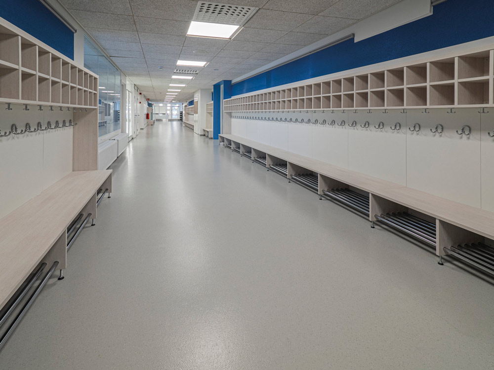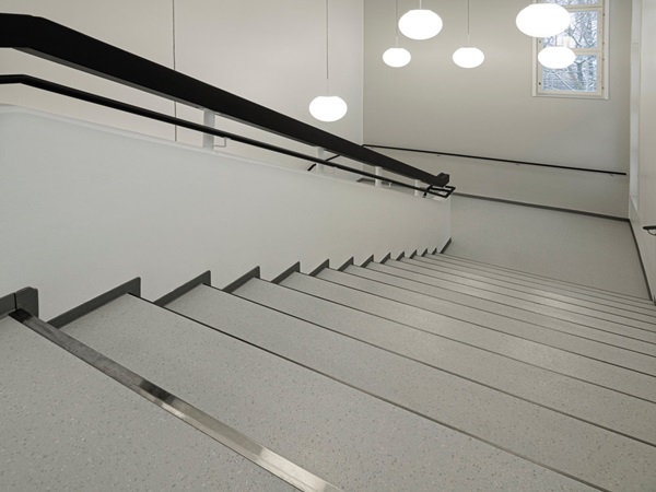 “In terms of design, we opted for 3.5 mm norament 926 satura nTx tiles in beige. A few small inlays in various shades of blue set chic accents”, explained interior designer Ulla Uitto. Additionally, nora stairtreads were to give the corridors and classrooms the same harmonious appearance as the stairway. “As far as the type of installation was concerned, we decided on nora nTx, as this ensured that there would be no undesired interactions with the subfloor and that the installation would be completed more quickly than usual”, said Arosarka. This is how installation with nora nTx works: a rubber-based adhesive is applied to the underside of the nora floor coverings and covered with a protective film, which is removed before installation. On site, the first task is to sand the old substrate, vacuum and prime it. After that, you simply cut the new floor covering to size, remove the protective film, align it, smooth it out, roll it and you’re done. The floor is immediately ready for use.