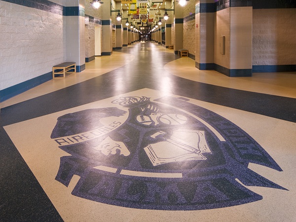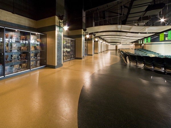 During twelve months of planning that preceded 30 months of construction on the Airedale Arena, school officials visited 42 different basketball facilities to gather ideas on the proposed arena. After careful evaluation of these facilities, a flooring test in a local elementary school and consideration of recommendations from the architect, school officials chose nora® flooring for the 1/8-mile concourse behind the seating area, the promenade that leads visitors past the trophy case, school store and concession areas and the arena seating area. The enhanced durability and comfort that students and fans experience is exactly the winning combination that school administrators strived for when they chose the rubber floor covering.
