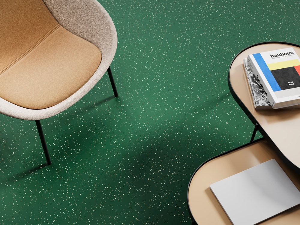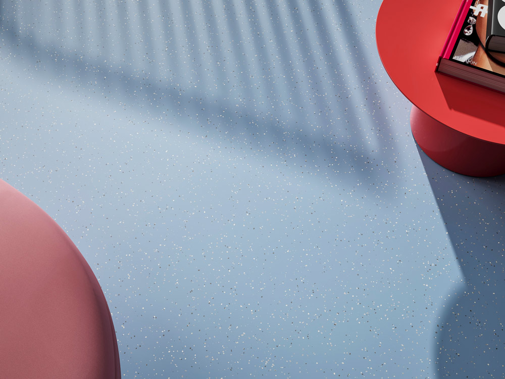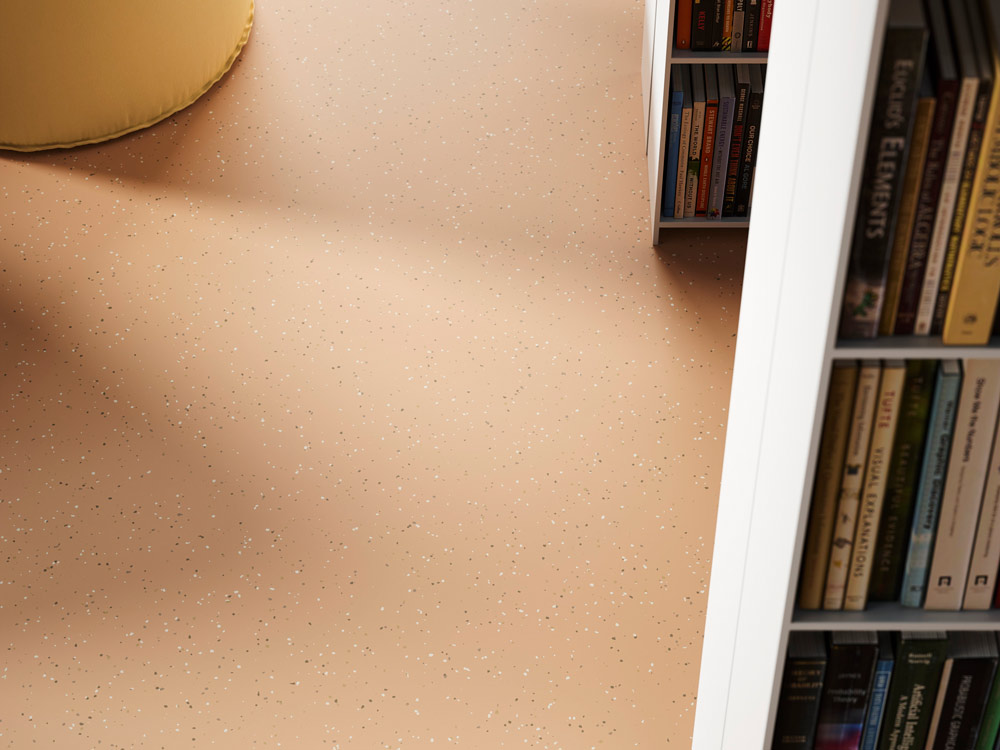 Revestimiento para suelos de caucho con un diseño que disimula la suciedad, compuesto por cinco gránulos de colores diferentes para áreas de mucho tráfico, disponible con una superficie lisa.