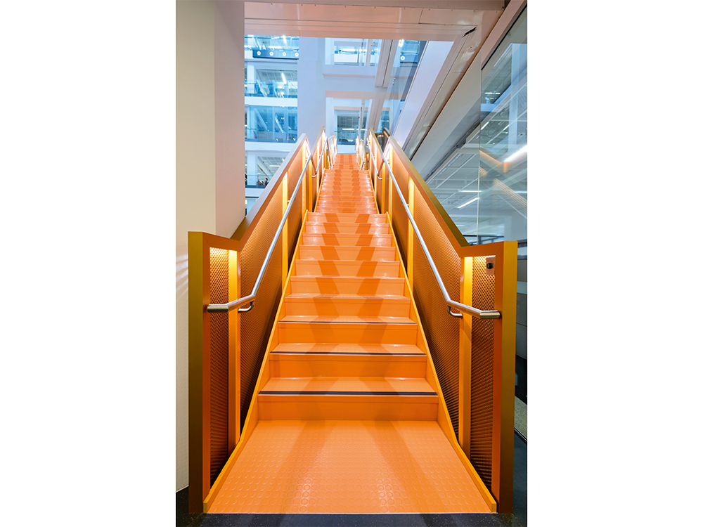 Peldaño preformado con estructura de alivio plana, direccional con un diseño de grano fino y marmoleado moderno, absorción de los ruidos de impactos 12 dB. Cada peldaño preformado es diferente; cada peldaño preformado constituye, en sí mismo, un ejemplar único.