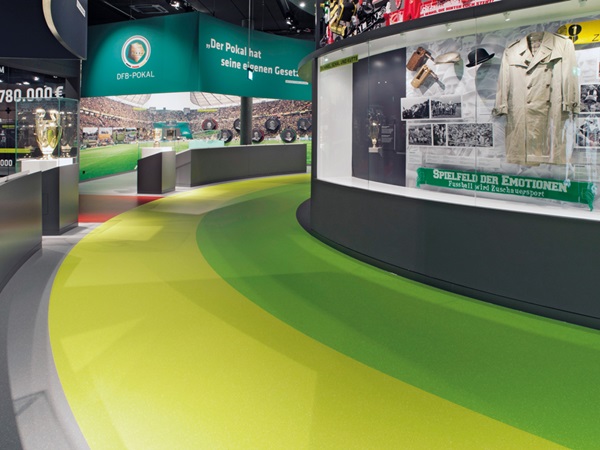 The spatial and dramaturgical concepts were created by TRIAD Berlin following its assignment by the German Football Association foundation DFB-Stiftung Fußballmuseum. The exhibition planners translated the leitmotif “We are football” into a multimedia experience with over 1,600 exhibits. One essential constituent of the spatial concept is the rubber floor coverings from nora systems: In various powerful colours and with dynamically curving inlays, they present attractive eyecatchers in all exhibition areas.