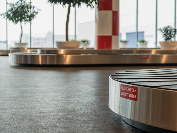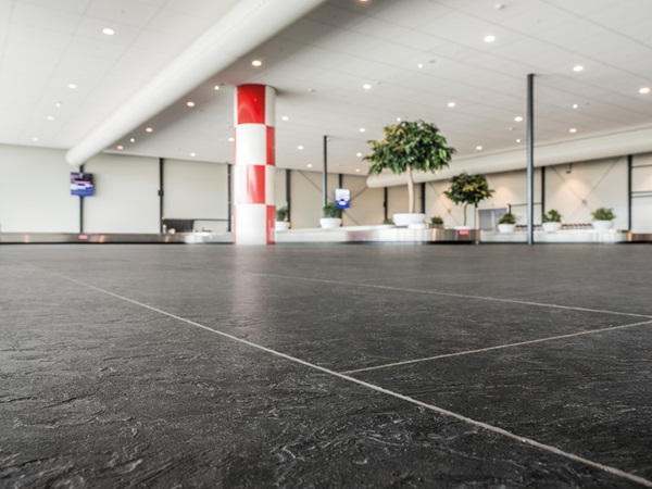Rubber has the unique characteristic that it is durably elastic and it can withstand heavy loads. Therefore, the nora floor coverings are known for their advantages as far as ergonomics and walking comfort are concerned. Thanks to their lifelong elasticity and their shock absorbing effect, they make walking and standing easier for both passengers and airport personnel - pressure on the spine and on the joints is noticeably reduced. The noise level within the building is also significantly lower with a rubber floor covering than when hard floors such as stone are installed. The material brings an extraordinary reduction in the level of walking noise and at the same time, the sound of rolling baggage and other loads is subdued.