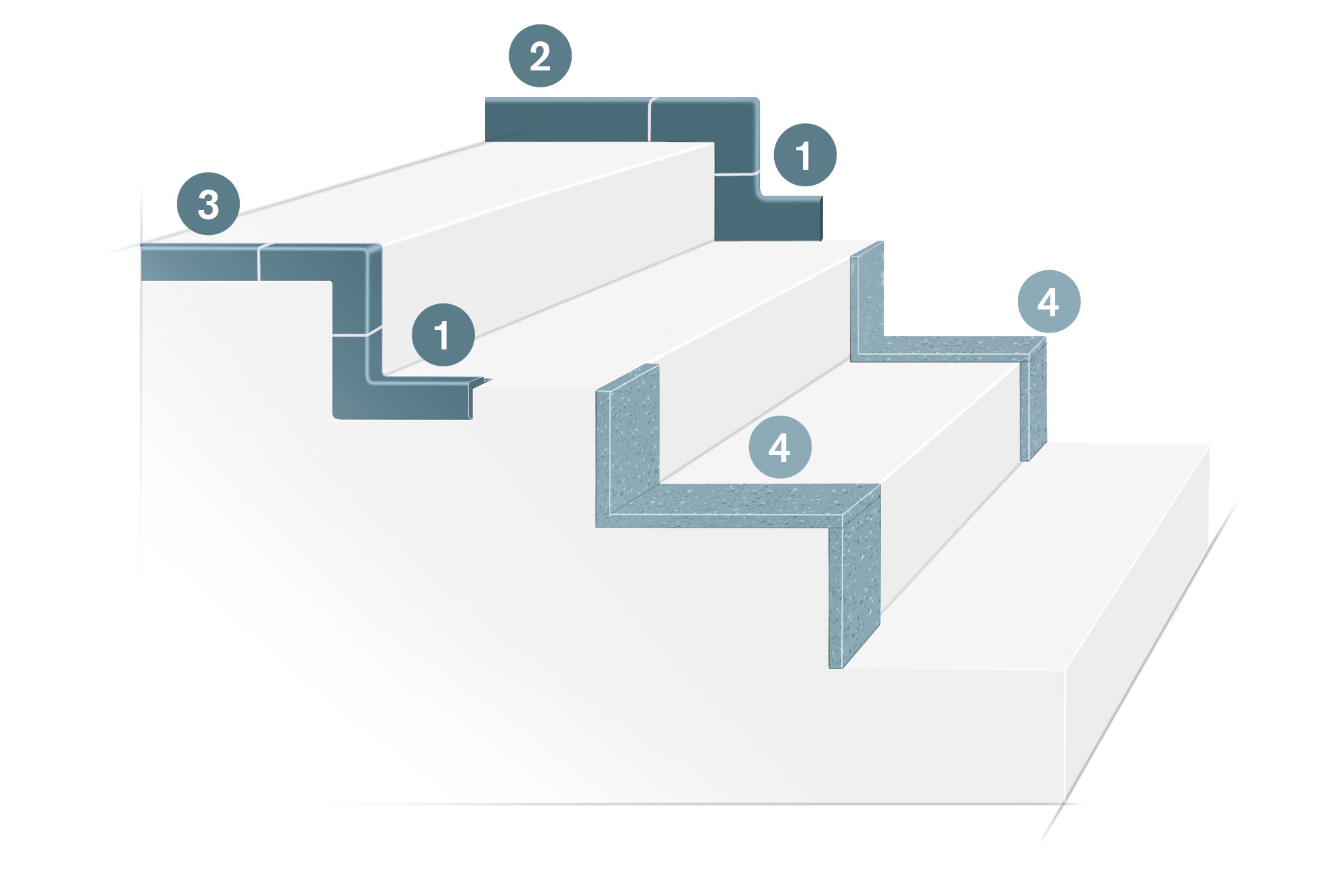 Nuestro portafolio de sistemas de revestimiento para escaleras incluye una variedad de accesorios a juego para escaleras. Además de los ángulos para escaleras que se utilizan para crear conexiones lisas entre escaleras en ángulo recto tanto en la pared como en el lado de la barandilla, nuestra gama de productos incluye zócalos y perfiles adecuados para plataformas y rampas. La banda de la escalera ofrece la posibilidad de crear márgenes laterales para la pared y los lados de las barandillas, así como diseños de márgenes continuos en salas y pasillos.