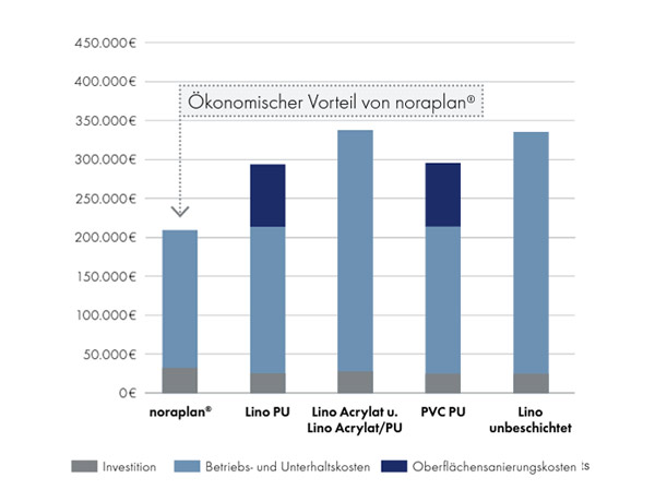 Die Wirtschaftlichkeitsbetrachtung eines Bodens zeigt, dass die Investitionskosten nur einen geringen Teil der Gesamtkosten ausmachen. Bis zu 90 Prozent der Kosten fallen erst im Laufe der Nutzungsdauer an. Dazu gehören auch regelmäßig wiederkehrende Sanierungen temporärer Oberflächenbeschichtungen, die oft mit alkalischen Grundreinigungen und Neubeschichtungen verbunden sind. Durch das Aus- und Wiedereinräumen der Räume, das Sperren entsprechender Flächen wegen notwendiger Trocknungszeiten entstehen Aufwendungen für Personal sowie Ausfallzeiten und damit Kosten.