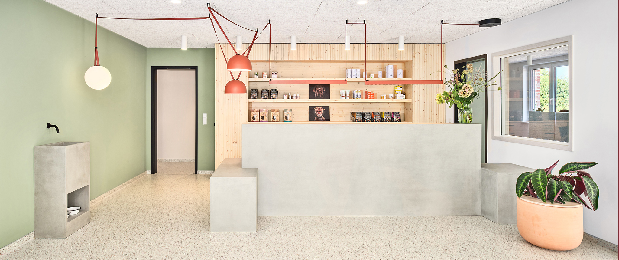Seit mehr als 40 Jahren ist die Tierärztliche Praxis Ottersberg ein geschätzter Partner für Tiere und ihre Besitzer – an 365 Tagen im Jahr. In dieser Zeit hat sich die Praxis kontinuierlich weiterentwickelt und ihre Expertise in zahlreichen Bereichen vertieft. Mit einem über 70-köpfigen Team und einer erstklassigen Ausstattung an modernen Instrumenten und medizinischen Geräten bietet sie herausragende Versorgung nicht nur für Kleintiere, sondern auch für Nutztiere und Pferde. Auch beim Neubau setzt man Maßstäbe – dies unterstreicht die Gestaltung der Räumlichkeiten mit hohen Ansprüchen an Funktionalität und Innovation eindrucksvoll. „Wann immer man mit offenen Augen durch Gesundheitseinrichtungen läuft, entdeckt man nora Böden“, so Britta Borrmann. „Denn die Kautschukbeläge bringen alle Eigenschaften mit, die in diesem Segment benötigt werden.“ So legte die Designerin beispielsweise großen Wert auf ökologische Aspekte. Um ein gesundheitsförderndes Umfeld sicherzustellen, wurden Bau-stoffe gewählt, die einen positiven Einfluss auf die Innenraumluft und das Wohlbefinden haben. „Unsere Anforderungen an den Boden waren: Verschleißfestigkeit, Langlebigkeit und natürlich ein modernes Design“, so die Projektplanerin weiter. Diese Ansprüche haben die Kautschukbeläge am besten erfüllt. Auch Tierpfoten fühlen sich auf den rutschsicheren und fußwarmen Böden wohl.