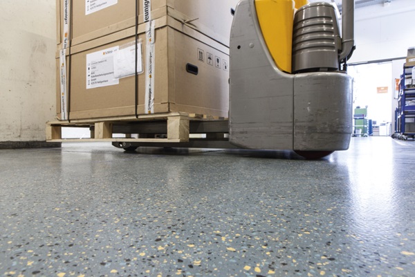 Boden, der Handhubwagen und anderen Flurförderfahrzeugen stand hält: norament grano, im Einsatz bei der Schleuniger AG, Thun