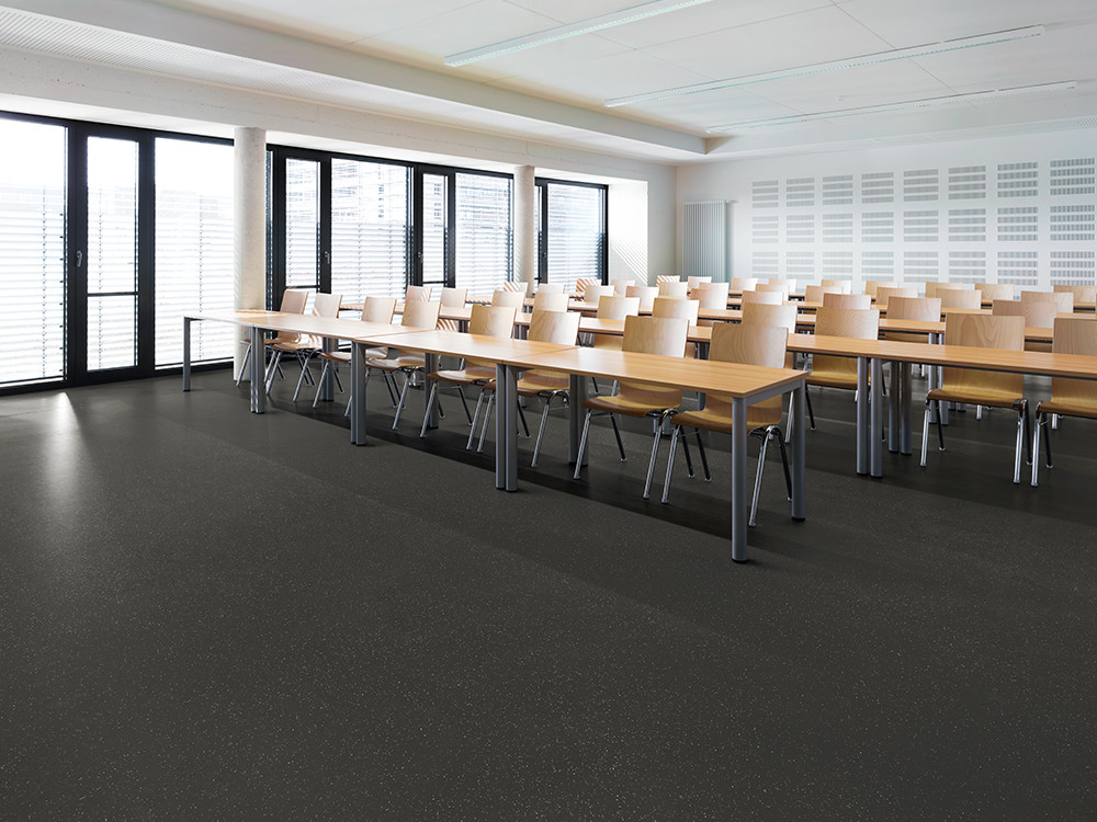 Revêtement de sol en caoutchouc se caractérisant par une alliance parfaite entre le caoutchouc à l’élasticité permanente et les éclats de granit incorporés de façon subtile et aléatoire. La fine incrustation des éclats dans le noraplan® unita lui confère une apparence discrète. Le design est délibérément simple et puriste.